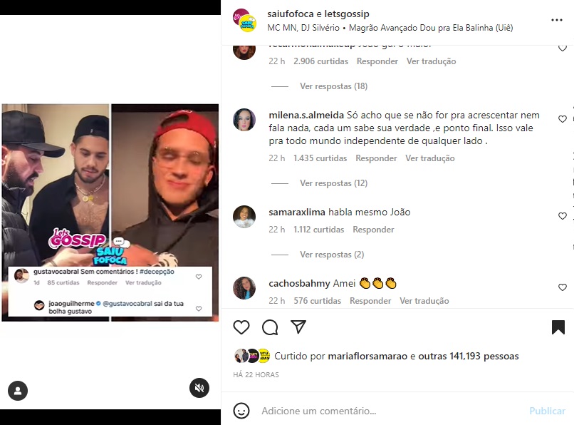 Outro internauta chegou, ainda, a afirmar que João Gui é o único da sua família que possui consciência na hora do voto. Desse modo, disparou: “O único que tem consciência da família! Sabe que a realidade que você não é de mundo! O voto é dele ele vota em que ele quiser pelos um se salva por que o resto não tá nem aí pras pessoas só pensa em neles mesmo Faz o L”.