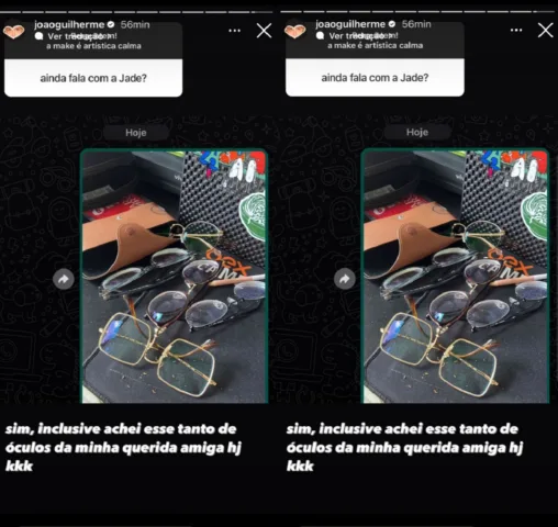 ”Ainda fala com a Jade?”, quis saber o internauta. João então publicou um print em que mandou foto de óculos da atriz para a própria e ainda escreveu: ”Sim, inclusive achei esse tanto de óculos da minha querida amiga hoje kkk”.