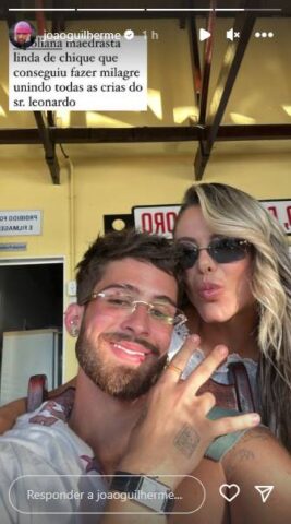 Dessa forma, por meio dos stories no Instagram, João Guilherme compartilhou um clique ao lado de Poliana Rocha e na legenda ainda a chamou de mãe: “@Poliana mãedrasta linda de chique que conseguiu fazer milagre unindo todas as crias do sr. Leonardo“, escreveu o ator. “Feliz por você estar aqui“, respondeu ela, também nos stories.