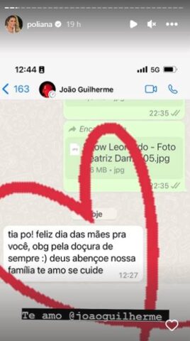 “Tia po! Feliz Dia das Mães pra você, obrigado pela doçura de sempre. Deus abençoe a nossa família e te amo se cuide“, disse o ator, que é filho de Naíra Avila. Por sua vez, Poliana agradeceu: “Te amo @joãoguilherme“, disse ela, através dos stories.
