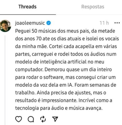 Dessa forma, por meio do Threads, João Lee explicou que pegou 50 músicas que Rita e Roberto gravaram da metade dos anos 1970, quando começaram a parceria, até as últimas criações e isolou a voz dela. “Cortei cada à capella em várias partes, carreguei e rodei todos os áudios em um modelo de inteligência artificial no meu computador. Demorou quase um dia inteiro para rodar o software, mas consegui criar um modelo de voz dela em IA”, escreveu ele.