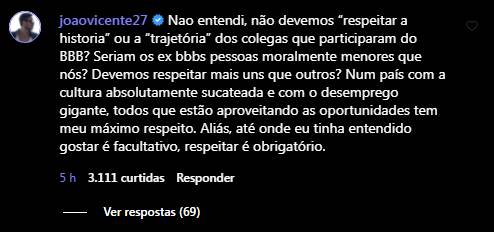 Ele continuou refletindo. “Seriam os ex-bbbs pessoas moralmente menores que nós? Devemos respeitar mais uns que outros? Num país com a cultura absolutamente sucateada e com o desemprego gigante, todos que estão aproveitando as oportunidades tem meu máximo respeito. Aliás, até onde eu tinha entendido, gostar é facultativo, respeitar é obrigatório”, pontuou João Vicente.