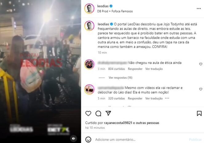 “Descobrimos que Jojo Todynho até está frequentando as aulas de direito, mas embora estude as leis, parece ter esquecido que é proibido bater em outras pessoas. A cantora armou um barraco na faculdade onde estuda com uma outra aluna e, em meio a confusão, deu um tapa na cara da menina como também a ameaçou“, afirmou ele, publicando a cena no feed da rede social.