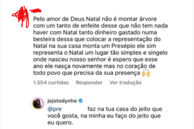Na publicação, a internauta afirmou que não concorda com a forma na qual Jojo decidiu decorar a casa para a data especial. “Pelo amor de Deus, Natal não é montar árvore com um tanto de enfeite desse que não tem nada haver com Natal tanto dinheiro gastado numa besteira dessa que colocar a representação do Natal na sua casa monta um Presépio ele sim representa o Natal um lugar tão simples e singelo onde nasceu nosso senhor é espero que esse ano ele nasça novamente mas no coração de todo povo que precisa da sua presença”, disse a pessoa, através do Instagram.