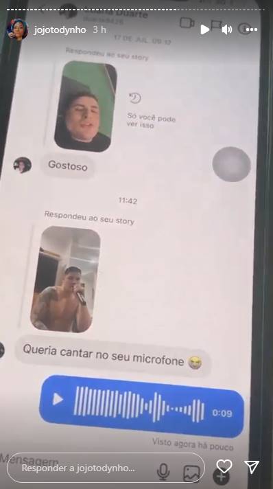 Jojo começa falando em sua conta oficial do Instagram Stories que Lucas vem recebendo fotos de mulheres sem roupa e pede o devido respeito: ”Tive que mandar um áudio porque ou te falar… Vocês se respeitem, tá? Cara eu vou falar pra você, tem gente que não se respeita, né? E não é só essa não, essa é a que eu mostrei pra vocês. É cada mensagem que o povo manda, manda até foto pelada”, destaca.