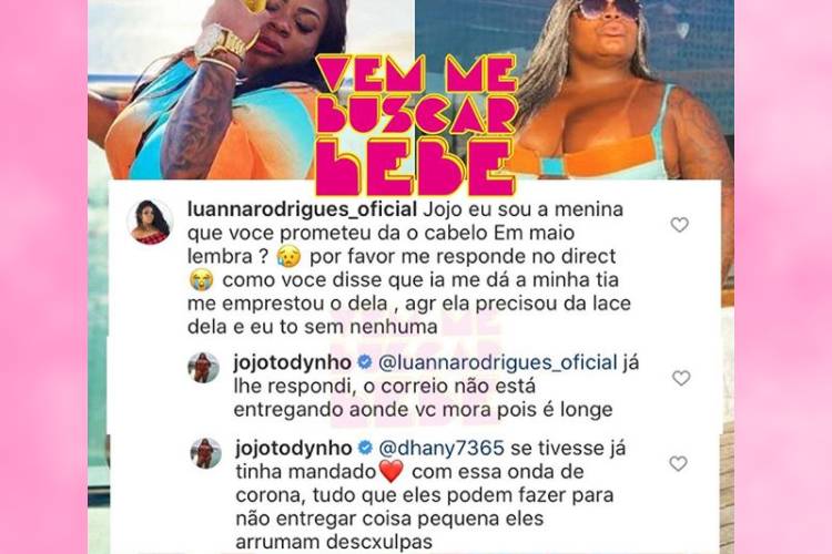 Na ocasião, a seguidora deixou um comentário numa foto recente da intérprete do hit ‘Que Tiro Foi Esse?’, em que a questionava sobre uma lace que Jojo teria prometido para a mesma por volta de maio. “Eu sou a menina que você prometeu dá o cabelo em maio, lembra? Como você disse que ia me dá a minha tia me emprestou o dela, agora ela precisou da lace e eu estou sem nenhuma”, lamentou a internauta.