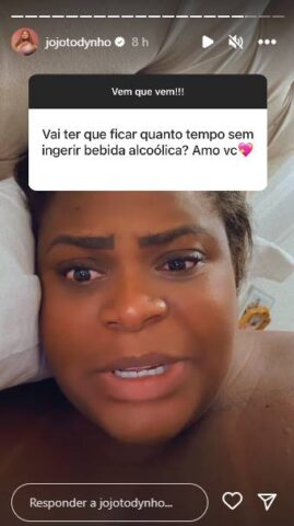 Dessa forma, por meio dos stories no Instagram, Jojo Todynho foi questionada se poderia voltar a beber e ela logo respondeu a dúvida: “Vai ter que ficar quanto tempo sem ingerir bebida alcoólica?“, indagou uma internauta. “Acho que por seis meses [Jojo logo chora]. É muita luta“, respondeu a cantora.