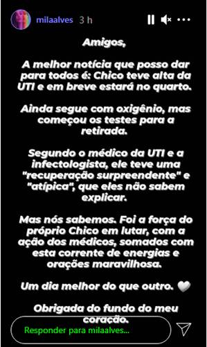 “Amigos, a melhor notícia que posso dar para todos é: Chico teve alta da UTI e em breve estará no quarto. Ainda segue com oxigênio, mas começou os testes para a retirada. Segundo o médico da UTI e a infectologista, ele teve uma ‘recuperação surpreendente’ e ‘atípica’, que eles não sabem explicar”, escreveu no Stories do Instagram.