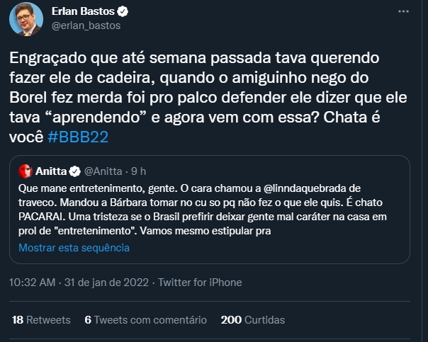 Dessa forma, por meio de uma publicação no Twitter, Anitta destacou que Rodrigo merecia sair do BBB22 por ser ‘mal caráter’. No entanto, Erlan Bastos rebateu o comentário da cantora e destacou que a ‘chata’ na verdade é ela, por querer tirar o entretenimento do Brasileiro.