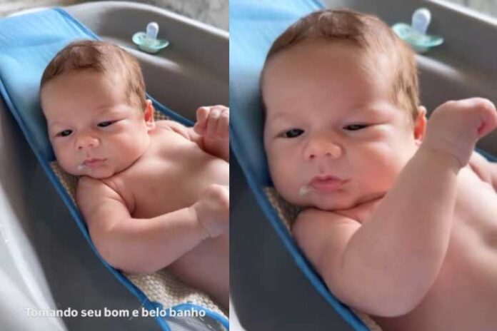 O que chamou a atenção foi que o caçula não chorou, ficando quietinho enquanto a mãe mostrava o momento. “Tomando seu bom e belo banho”, disse a influenciadora, que desde o nascimento do filho tem encantado os internautas com registros fofos.
