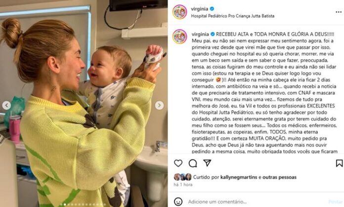 No feed do Instagram, Virginia Fonseca celebrou a boa notícia, também compartilhando de sua fé em nosso Senhor Jesus, após seu menino receber a cura. “RECEBEU ALTA e TODA HONRA E GLÓRIA A DEUS!!!!! Meu pai, eu não sei nem expressar meu sentimento agora, foi a primeira vez desde que virei mãe que tive que passar por isso, quando cheguei no hospital eu só queria chorar, morrer, me via em um beco sem saída e sem saber o que fazer, preocupada, tensa, as coisas fugiram do meu controle e eu ainda não sei lidar com isso (estou na terapia e se Deus quiser logo logo vou conseguir)!!“, iniciou ela.