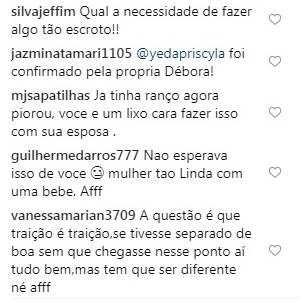 “Que nojo desse tipo de homem! Traidor”, disparou uma terceira. “Não tem respeito a mulher e nem a filha”, afirmou uma quarta. “Só espero que ela não volte pra ele. Ela tem que erguer a cabeça e dar a volta por cima”, optou um quinto internauta.