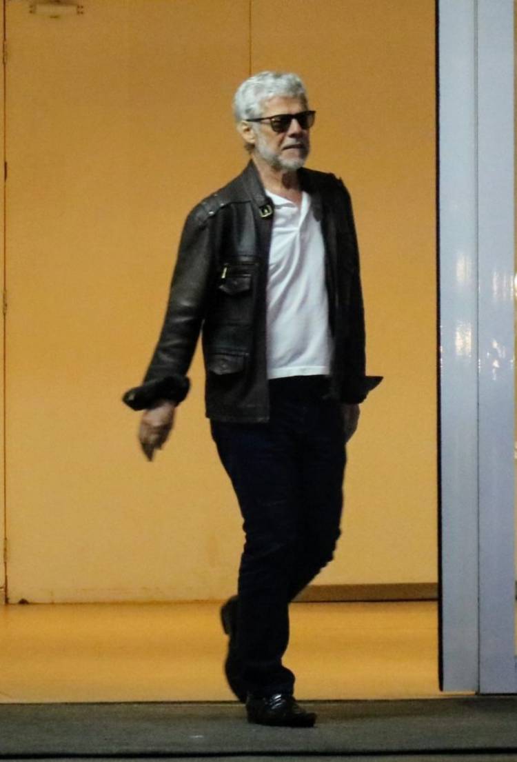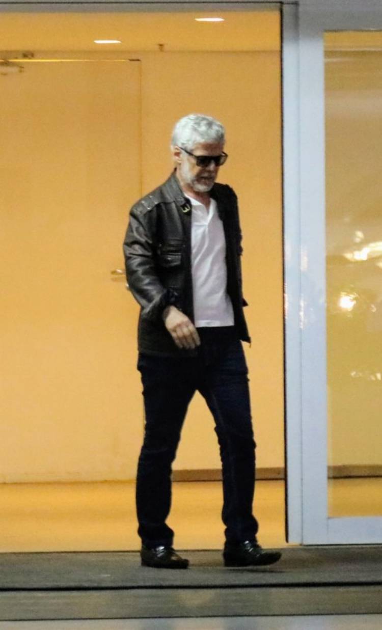 Com um look mais despojado, o ator estava usando uma calça e jaquete preta, uma camisa branca e um óculos de sol.