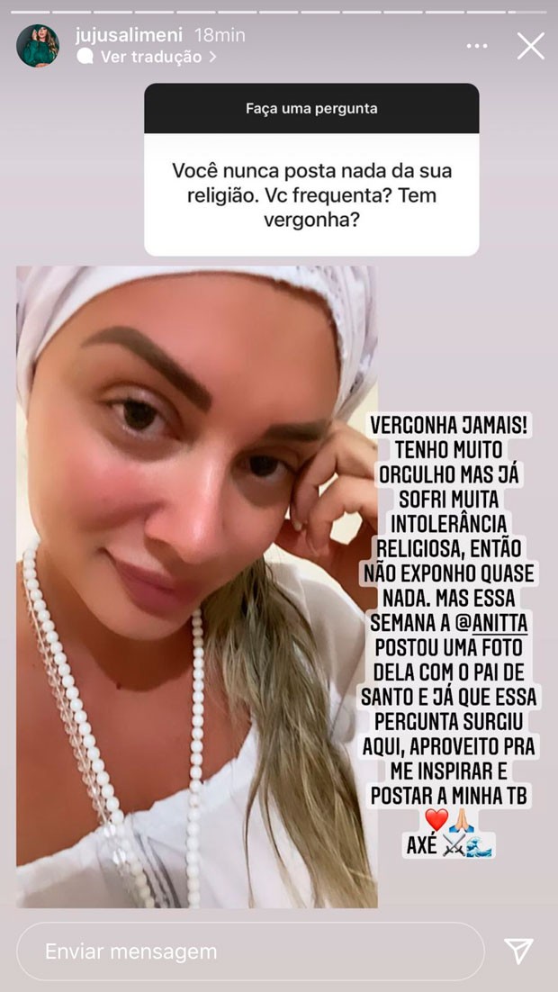 Dessa forma, por meio dos stories do Instagram, Juju Salimeni não se limitou e comentou a sua felicidade de ser integrante da umbanda. “Você nunca posta nada da sua religião. Você frequenta? Tem vergonha?”, questionou um seguidor pela caixinha de perguntas.