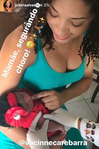 Juliana Alves postou neste sábado (30) em seu Instagram, uma foto da primeira vacinação da filha, Yolanda, que nasceu no último dia 21.