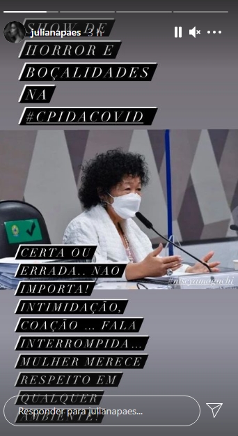 “Show de horror e boçalidades na #CPIdaCovid. Certa ou errada… Não importa! Intimidação, coação… Fala interrompida… Mulher merece respeito em qualquer ambiente”, escreveu Juliana no Stories. Ela ainda colocou uma foto de Nise durante o depoimento.