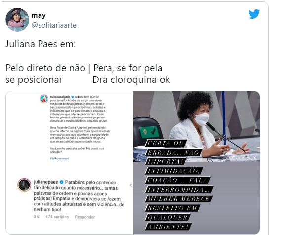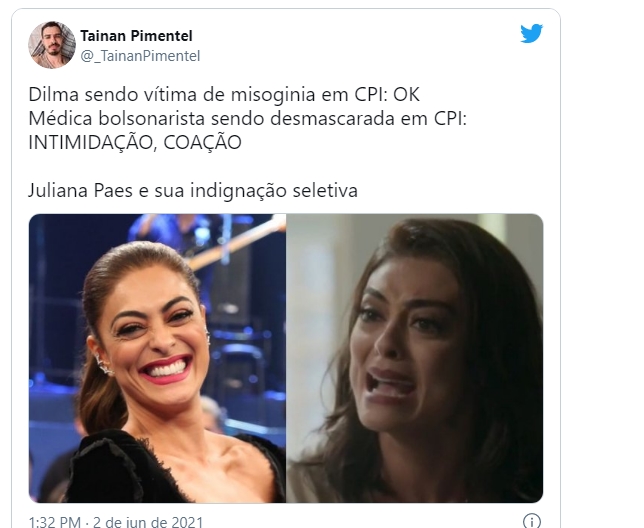 “A Juliana Paes tá acompanhando a CPI sempre ou só resolveu se meter aleatoriamente agora?”, disse uma internauta. ’Certa ou errada, não importa’, importa sim, porque como errada ela tá ajudando Bolsonaro a deixar meio milhão de pessoas morrerem de covid”, escreveu mais um. “A Juliana Paes jogou a última pá de terra na própria cova”, comentou outro. Foram alguns comentários.