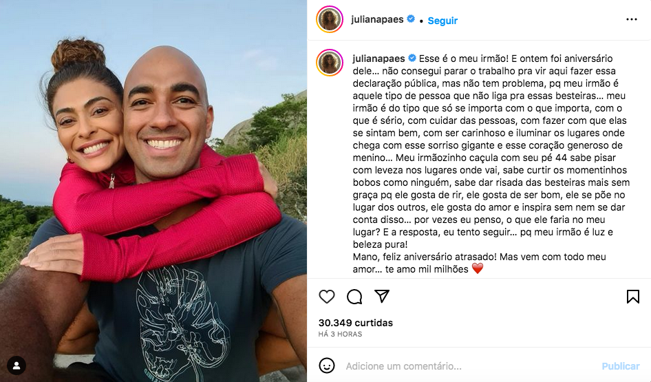 Por fim, a carioca demonstrou seu amor pelo irmão. “Por vezes, eu penso o que ele faria no meu lugar? E a resposta, eu tento seguir porque meu irmão é luz e beleza pura! Mano, feliz aniversário atrasado! Mas vem com todo meu amor… Te amo mil milhões”, encerrou.