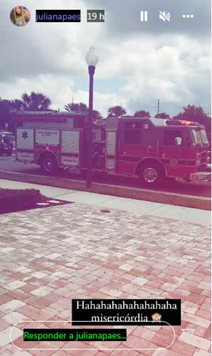 Nos stories do Instagram, Juliana Paes publicou um vídeo do momento em que recebe a visita de uma viatura do Corpo de Bombeiros na porta da sua casa, com direito a sirene e tudo. “hahahahaha Meu Deus… quando os homens vão fritar um bacon e disparam o alarme de incêndio.”, brincou a atriz na legenda.