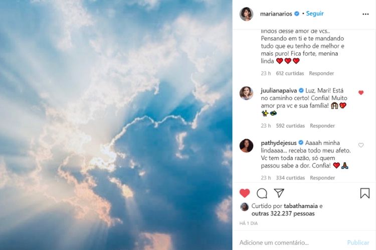Mariana Rios, para passar o comunicado aos fãs, acabou fazendo um texto mais do que emocionante. A mensagem comoveu a amiga Juliana Paiva, que fez questão de deixar uma mensagem.