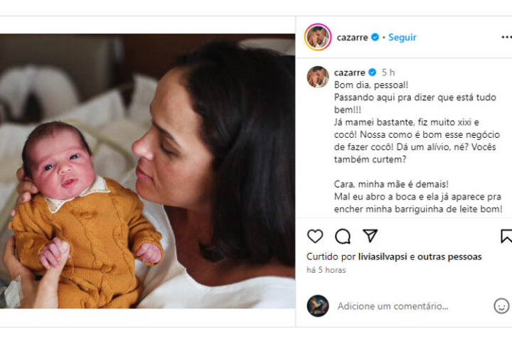 Na sequência, Juliano Cazarré continuou a descrever os primeiros acontecimentos da vida do herdeiro, agradecendo a todos pelo carinho. “Cara, minha mãe é demais! Mal eu abro a boca e ela já aparece pra encher minha barriguinha de leite bom! Hoje ela me botou essa roupa maneira e pediu pro funcionário dela – um cara estranho com um cabelo amarelo, parecendo um quiosque – pra tirar umas fotos da gente. O funcionário da minha mãe é até maneiro apesar do cabelo esquisito, só que ele dorme muito e a cara dele é estranha e me pinica todo quando vem me dar beijinhos“, continuou.