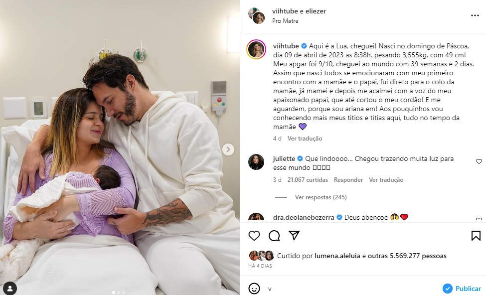 Na ocasião, Viih Tube, por meio de um post, anunciou que Lua chegou ao mundo. Assim, deu mais detalhes sobre o nascimento tão esperado da pequena: “Aqui é a Lua, cheguei! Nasci no domingo de Páscoa, dia 09 de abril de 2023 as 8:38h, pesando 3,555kg, com 49 cm! Meu apgar foi 9/10, cheguei ao mundo com 39 semanas e 2 dias. Assim que nasci todos se emocionaram com meu primeiro encontro com a mamãe e o papai, fui direto para o colo da mamãe, já mamei e depois me acalmei com a voz do meu apaixonado papai, que até cortou o meu cordão!”.