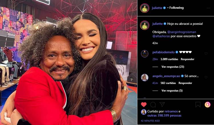 Em seu perfil no Instagram, Juliette fez questão de compartilhar o momento com os seguidores. “Hoje eu abracei a poesia! Obrigada, @serginhogroisman @altashoras por esse encontro ❤”, disse a paraibana na legenda.