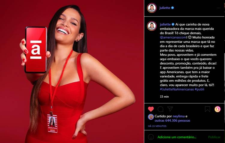 Ela continuou. “Meu povo, aproveitem e já comentem aqui embaixo o que vocês querem: desconto, promoção, conteúdo, dicas! E aproveitem também pra já baixar o app Americanas, que tem a maior variedade, entrega rápida e frete grátis em milhões de produtos. E, claro, vou aparecer muito por lá, tá?! #JulietteNaAmericanas #publi”, finalizou.