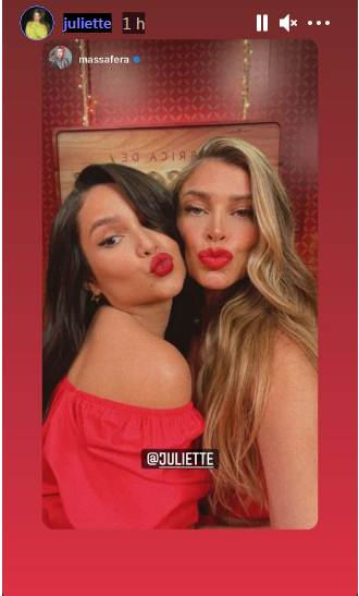 Em seu perfil no Instagram, Juliette repostou alguns stories ao lado de Massafera fazendo caras e bocas pras câmeras. De figurino vermelhos, as duas sobressaíram no clique lado a lado na rede sociais.