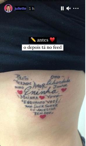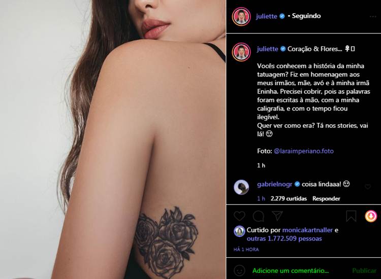 Na legenda do feed, ela explicou. “Coração & Flores… Vocês conhecem a história da minha tatuagem? Fiz em homenagem aos meus irmãos, mãe, avó e à minha irmã Eninha. Precisei cobrir, pois as palavras foram escritas à mão, com a minha caligrafia, e com o tempo ficou ilegível. Quer ver como era? Tá nos stories, vai lá!”, disse.