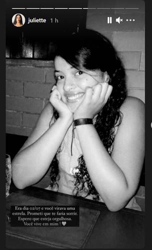 A campeã do BBB21 publicou uma foto da caçula em seu stories no Instagram. “Era dia 02/07 e você virava uma estrela. Prometi que te faria sorrir. Espero que esteja orgulhosa. Você vive em mim“, escreveu Juliette, o que chamou a atenção foi a semelhança das duas.