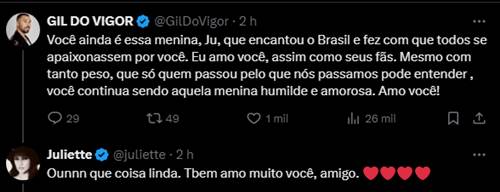 Gil do Vigor não perdeu tempo e consolou a artista, que conheceu no confinamento e se aproximou da campeã, apesar das diferenças entre os dois. “Você ainda é essa menina, Ju, que encantou o Brasil e fez com que todos se apaixonassem por você. Eu amo você, assim como seus fãs. Mesmo com tanto peso, que só quem passou pelo que nós passamos pode entender, você continua sendo aquela menina humilde e amorosa. Amo você!”, declarou o também ex-BBB.
