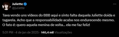Com certeza o ‘BBB21’ foi um marco na história do reality da Globo. E às vésperas da estreia do ‘BBB25’, Juliette, campeã da edição, entrou em clima de nostalgia e fez uma publicação na tarde deste sábado (04), no X (antigo Twitter).
