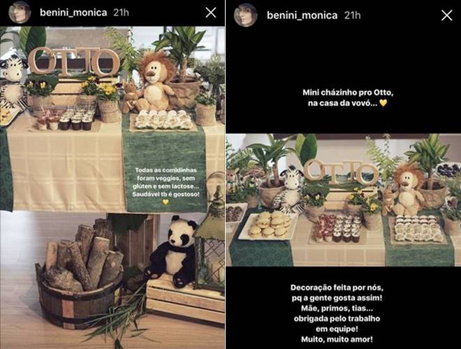 “Todas as comidinhas foram veggies, sem glúten e sem lactose… Saudável também é gostoso!”, disse Monica, que logo em seguida completou: “Mini chazinho pro Otto na casa da vovó…Decoração feita por nós, porque a gente gosta assim! Mães, primos e tias…obrigada pelo trabalho em equipe. Muito, muito amor!”.