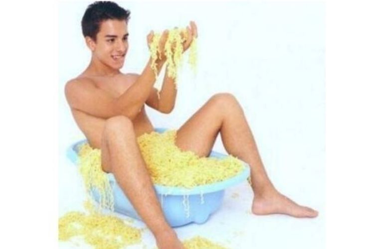 A imagem em que o irmão de Sandy acabou viralizando foi para uma propaganda de macarrão instantâneo. Junior Lima ainda era um adolescente na imagem e surgiu em uma banheira repleta do alimento.