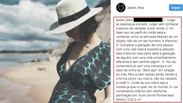 Então, Junior rebateu: “1- Julgar as pessoas já é errado. Julgar sem conhecer a pessoa de verdade é pior ainda. 2- Vir fazer isso no perfil do irmão dela e comentar como se estivesse falando de um objeto, não de um ser humano, é ofensivo. 3- Comparar a gestação de uma pessoa com uma vida inteira exposta (e atacada pela mídia em boa parte dela) à gestação de alguém com uma vida completamente diferente é sem sentido algum. 4- No seu comentário já vem uma cobrança e um peso de como eu ‘devo agir’ em relação ao meu filho que nem nasceu ainda. Sendo que a forma como vou criá-lo não diz respeito a você! 5- Cuide da sua vida e seja a mudança que você quer ver no mundo. 6- Ler comentários inteiros sem nenhuma pontuação sim é um porre! Pontue seus textos. Luz para você!“.