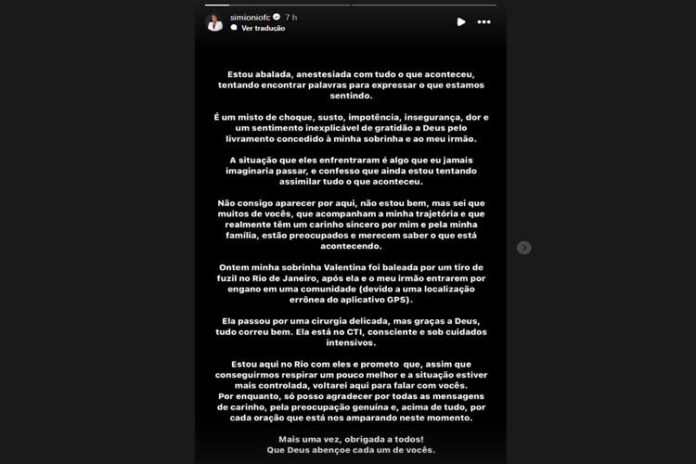 Tudo aconteceu quando o pai da jovem entrou de carro por engano no local, e o veículo foi atingido pelo disparo. A ex-participante de “A Fazenda” explicou que a sobrinha segue estável após realizar o procedimento. “Graças a Deus, tudo correu bem. Ela está no CTI, consciente e sob cuidados intensivos”, afirmou.