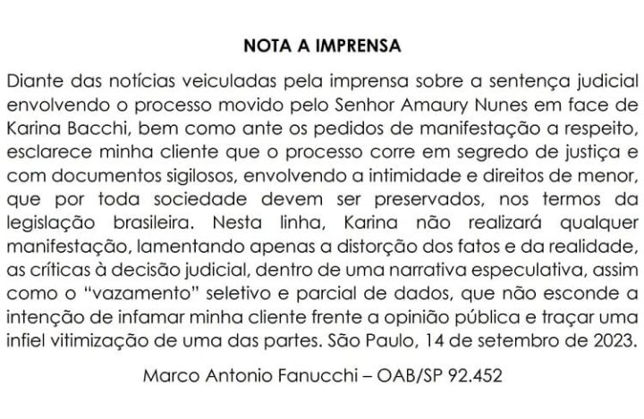 O advogado da atriz afirmou que Karina Bacchi não se pronunciará publicamente sobre a situação. Ele também lamentou o “vazamento seletivo e parcial” das informações e alegou que os fatos foram distorcidos com o propósito de manchar a imagem de sua cliente.