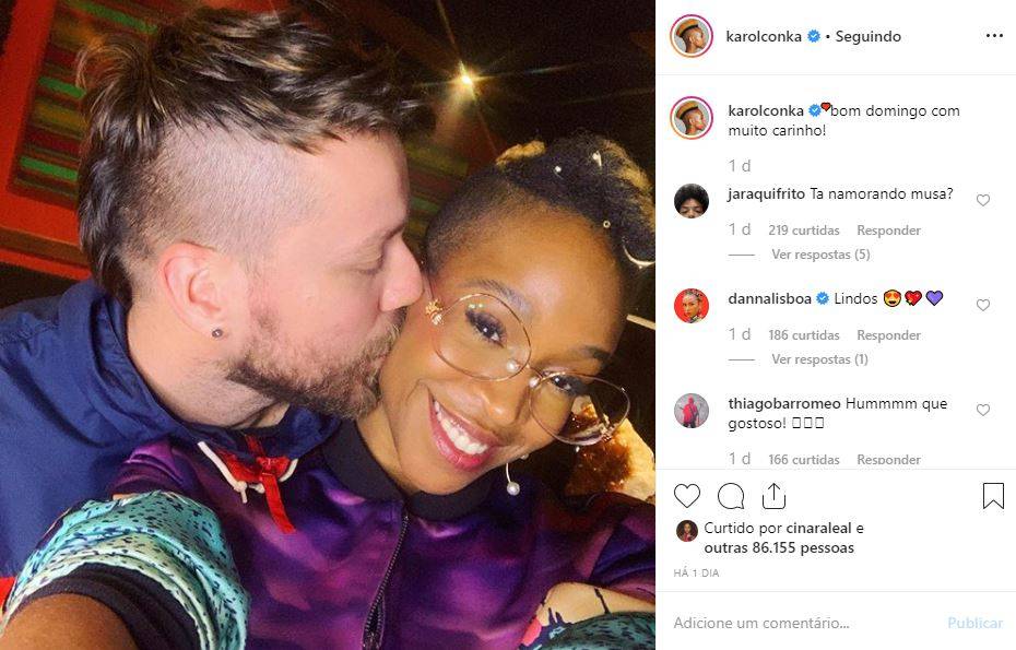 Karol Conka usou suas redes sociais para compartilhar a primeira foto ao lado do seu namorado, Thiago Barromeo, que é produtor e guitarrista de sua banda. Na imagem ela aparece recebendo um beijo carinhoso no rosto.