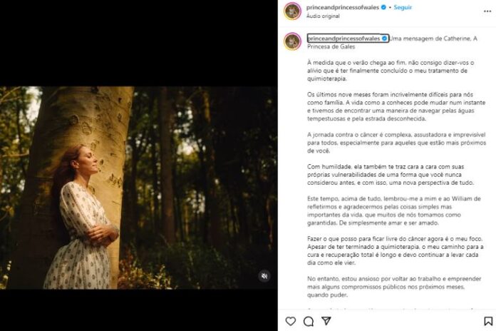 No texto, Middleton fez uma reflexão sobre a alegria de finalizar as sessões quimioterapia, porém deixou claro que o caminho até a cura ainda será longo: “À medida que o verão chega ao fim, não consigo expressar o quanto é um alívio ter finalmente concluído o meu tratamento de quimioterapia. Os últimos nove meses foram incrivelmente difíceis para nós como família”, iniciou no feed do Instagram.