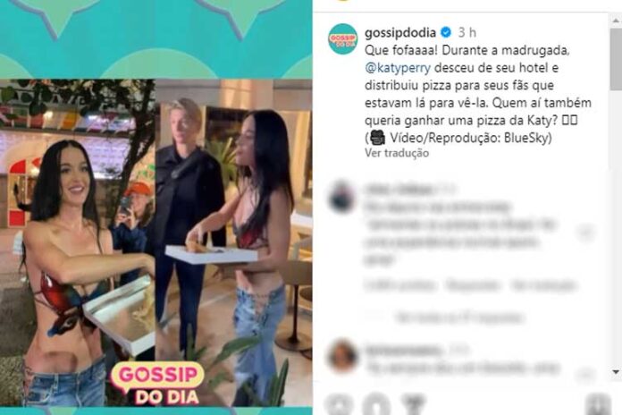 Hospedada no Copacabana Palace, um dos hotéis mais luxuosos do Rio, a estrela interagiu com os fãs na entrada do hotel. Em vídeo compartilhado nas redes sociais, Perry aparece usando um top de borboleta e calça jeans, enquanto distribuía pizza para as pessoas presentes.
