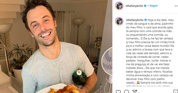 “Hoje é dia dele, meu irmão de sangue e de alma, padrinho do meu filho, o cara que acorda gato, tá sempre com uma comida na mão, ou esquentando uma comida, ou comendo. Ele que me faz ter certeza que meu filho precisa ter um irmão/irmã porque é a melhor coisa desse mundo! Ele que eu admiro a leveza com que leva a vida (às vezes até demais), admiro a força de vontade de correr, nadar, pedalar, mergulhar, surfar, treinar e me dá preguiça só de ver ele fazer metade disso… Ele que me manda beber água o tempo inteiro, fiscaliza minha alimentação e com certeza vai devolver meu filho com joelho ralado”, escreveu ela em um trecho.