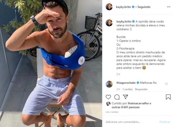 Ainda na publicação, ao expor o problema, Kayky pediu a ajuda dos fãs querendo saber se ele fazia a cirurgia ou apenas a fisioterapia para tratar a inflamação. “A opinião de vocês releva minhas dúvidas e eleva o meu cotidiano. Bursite 1- Operar o ombro Ou 2-Fisioterapia”, questionou.