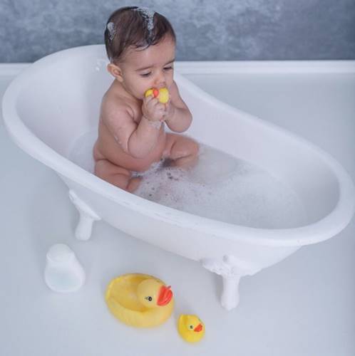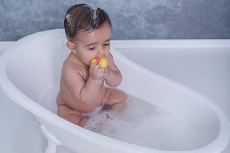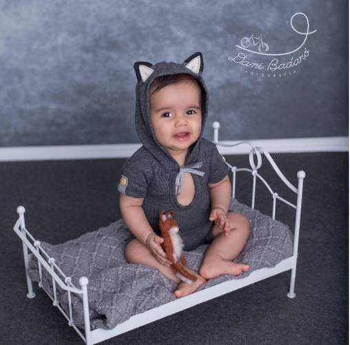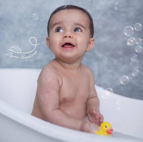 Nos registros, o bebê toma banho em uma banheirinha e brinca com um pato de borracha. Em outro clique, ele usa uma roupinha de raposa. Uma fofura!