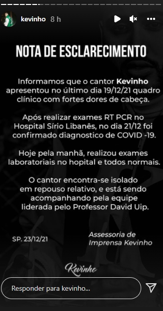 “Informamos que o cantor Kevinho apresentou no último dia 19/12/21 quadro clínico com fortes dores de cabeça. Após realizar exames RT PCR no Hospital Sírio-Libanês, no dia 21/12 foi confirmado diagnóstico de COVID-19. Hoje pela manhã, realizou exames laboratoriais no hospital e todos normais”, diz comunicado divulgado.