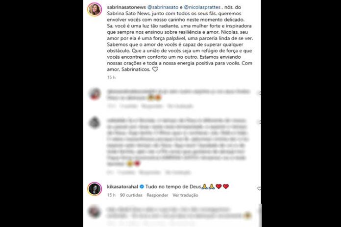 A notícia sobre a perda do bebê de Sabrina Sato e Nicolas Prattes fez com que o casal recebesse diversas mensagens de apoio em posts sobre o assunto nas redes sociais. Kika Sato, mãe da apresentadora, se pronunciou pela primeira vez em publicação de um fã-clube da famosa.