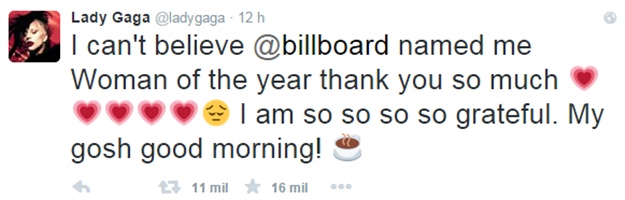 Pelo Twitter, Gaga comemorou a notícia. “Nem acredito que a Billboard me nomeou a Mulher do Ano, muito obrigada! Eu sou muito grata. Meu Deus bom dia”, escreveu.