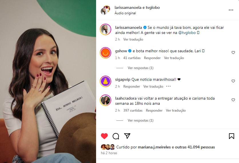 Em seu perfil no Instagram, Larissa Manoela fez um post contando a novidade. “Se o mundo já tava bom, agora ele vai ficar ainda melhor! A gente vai se ver na TV Globo”, disse a artista na legenda do post.