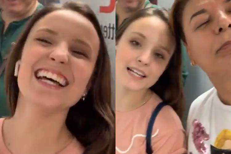 Eles aguardavam para embarcar em um voo, que estava atrasado e aproveitaram para curtir um pouco na fila, com bom humor. Os dois bateram papo e até sobrou para a mãe da estrela mirim do SBT.