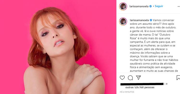 A atriz Larissa Manoela usou o Instagram, nesta segunda-feira (19), para alertar os fãs sobre um problema muito sério que pode afetar a vida de muitas mulheres. Ela fez um post para comentar sobre a campanha Outubro Rosa, que visa prevenir e propagar ações para evitar o câncer de mama.